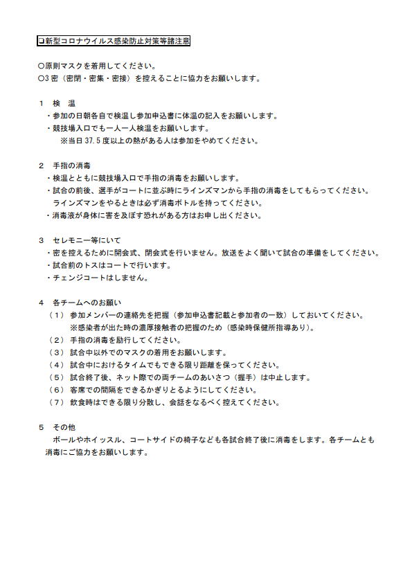 コロナ感染防止対策等諸注意・参加者名簿の確認をお願いします。