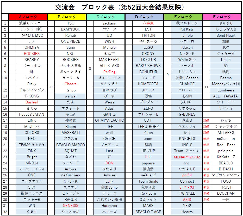 ブロック表は開催要項の下部に掲載しています。今一度チームのブロックをご確認の 上、交流会の参加申込をお願いします。
