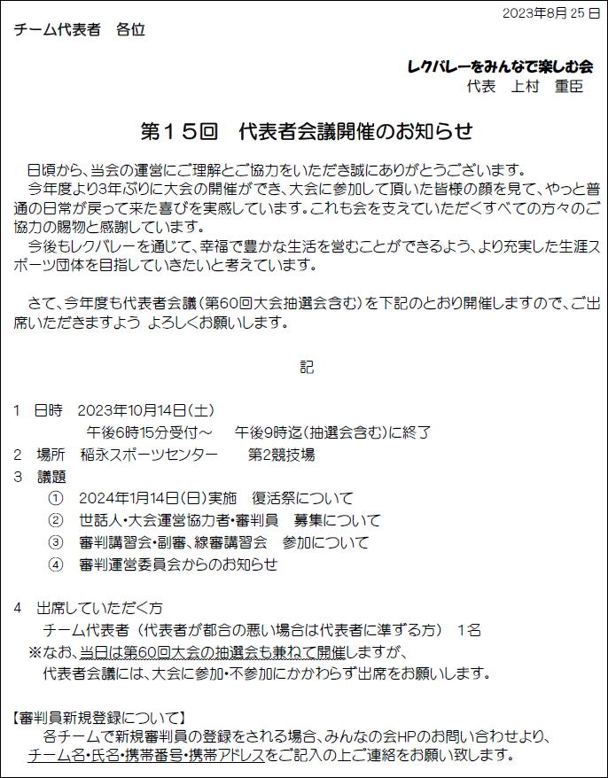 2023.08.28 第15回代表者会議開催のお知らせ