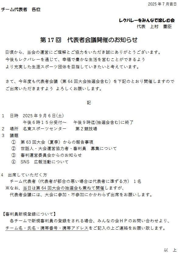 第17回代表者会議開催のお知らせ/第64回大会要綱 改版